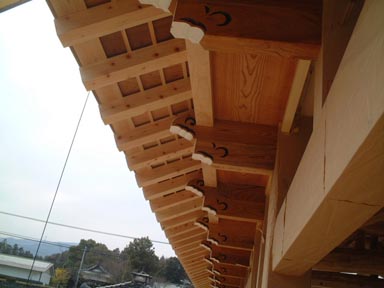 | 軒先には、腕と呼ばれるケヤキの飾りが付けられます。 杉板の木目が綺麗ですね。 |