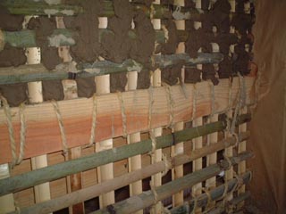 | 壁土が塗られた後、内側から見るとこんな感じです。 | 丁度上半分が土壁が塗られた部分です、塗られていない部分との比較が出来ます。 | |||||||||||