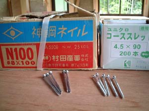 | 木工用の接着剤は環境対策品と書かれていました | 洋間の床材の合板は、11.5mmです | 床板を打ち付ける釘とネジが切ってある釘です | ||||||||||||||||||||||||