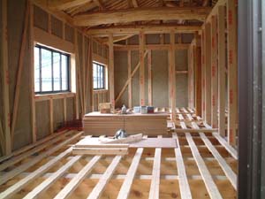 | 床下から上を見るとこんな感じです 丈夫なしっかりとした材木で床を支えているのが分かります | 和室の床板には杉板が使われています 赤みを帯びた板に木目と節が良いですね | 洋間のリビングには合板が張られます | ||||||||||||||||||||||||